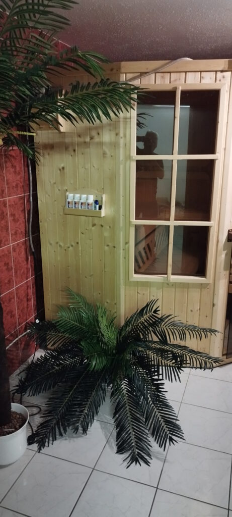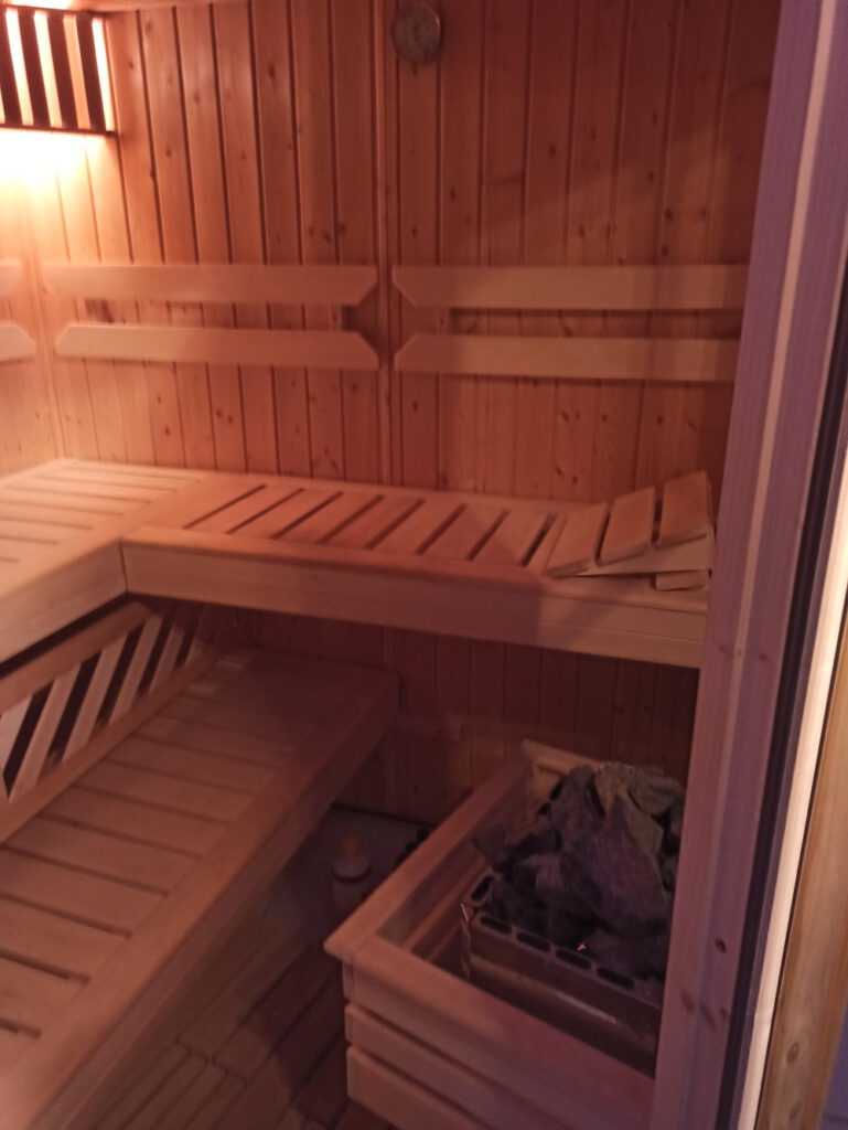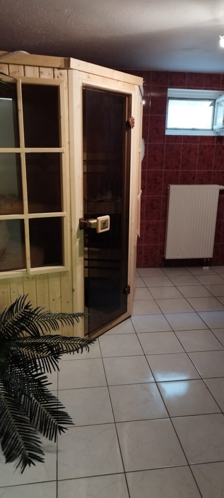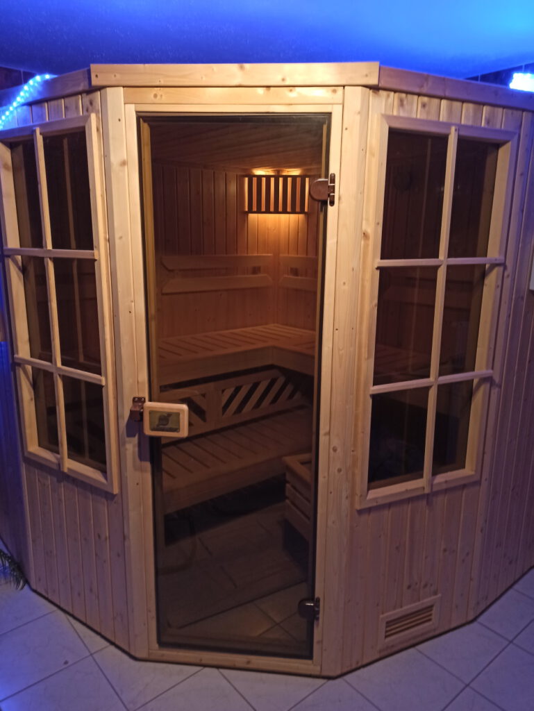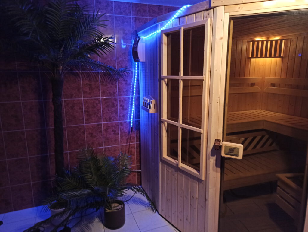Die Sauna ist raumhoch gefliest. In der Sauna ist zusätzlich eine Lichtwechselvorrichtung eingebaut so kann das saunieren noch gemütlicher gestaltet werden.