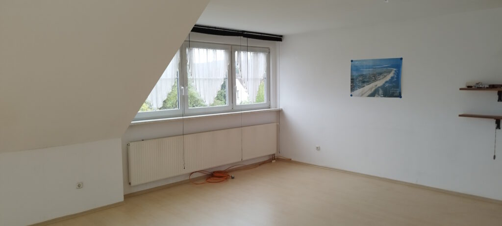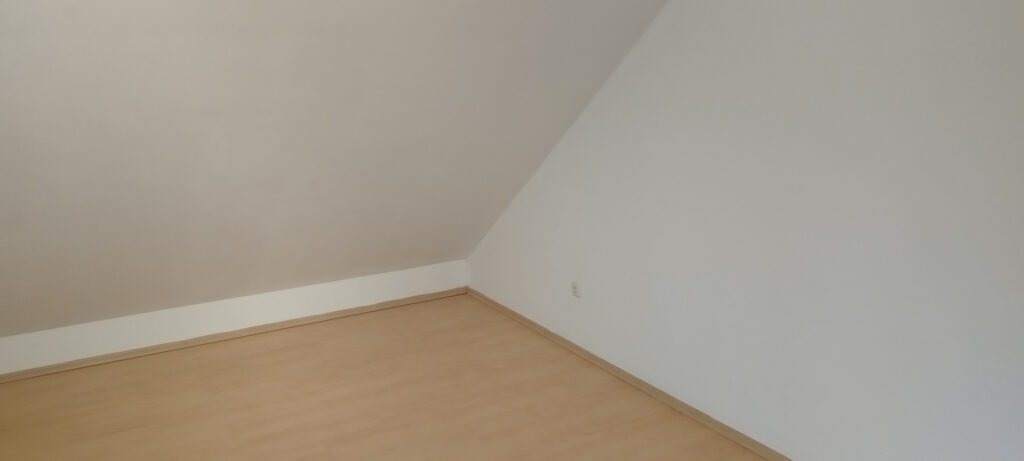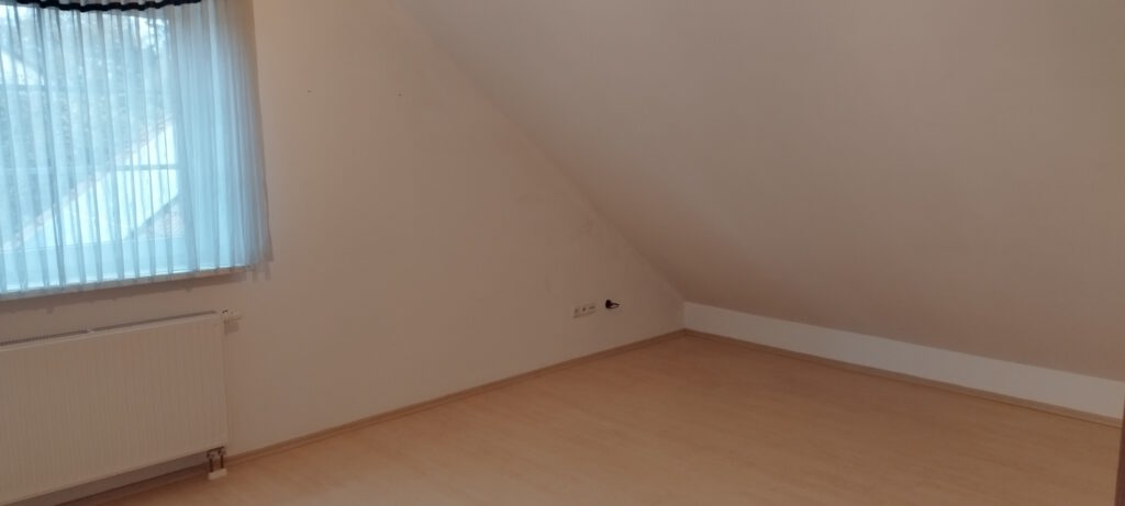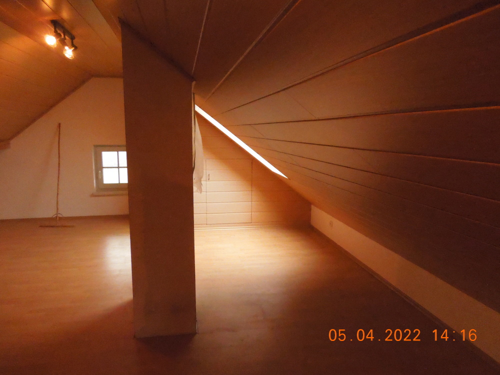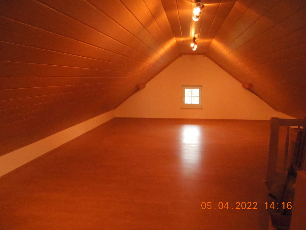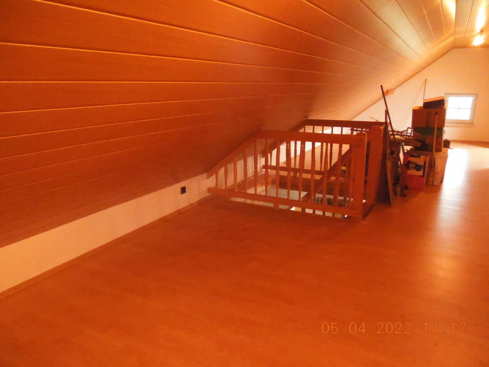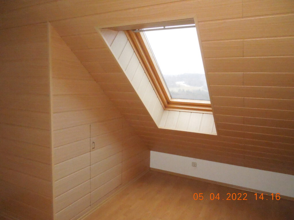 Zum ausgebauten Spitzboden gelangt man über eine wunderschöne Holztreppe, Farbe Eiche hell. Die Schrägen sind mit einer Holzpaneele Farbe – Eiche – verkleidet. Unter der Verkleidung befindet sich eine Dampfsperre, eine starke Dämmung (Steinwolle) mit anschließender Holzverschalung.