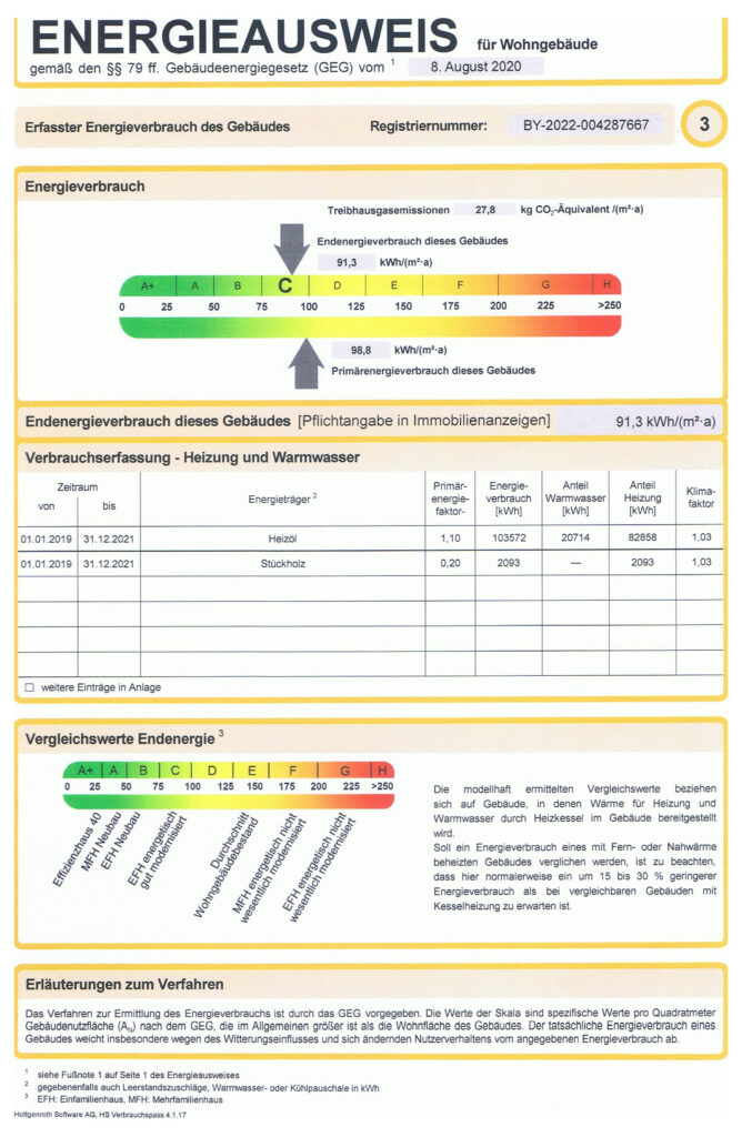 Endenergieverbrauch dieses Gebäude  91,3 kWh/(m²*a)